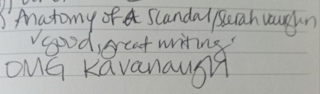In 2018 I read a book called Anatomy of a Scandal by Sarah Vaughan and noted ‘good, great writing’ in my journal. Then the Brett Kavanaugh hearings happened, and I added this to my notes: