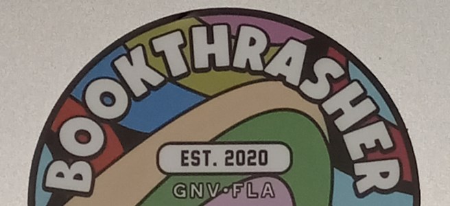 bookthrasher stickers are here! $3 each or two for $5 (includes shipping). At this time I can only accept payment by Venmo. The classic gray and black sticker measures 4.25" x 3.75" and the groovy color sticker measures 3" across. email me at bookchopshop@gmail.com to order. Thank you!